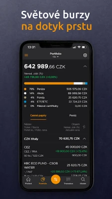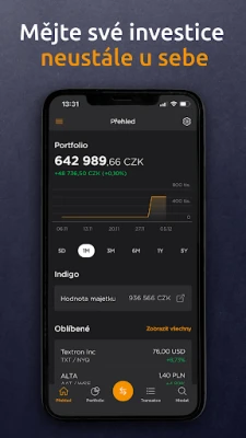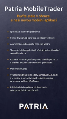 Zarządzaj swoim kontem Patria Finance 24/7. Śledź portfolio, transakcje giełdowe i ustawiaj alerty cenowe. Składaj zlecenia handlowe na akcje, ETF-y i certyfikaty bezpośrednio z aplikacji. Używaj mobilnego klucza do weryfikacji operacji. Otrzymuj ekskluzywne wiadomości i wideo z Patria.cz.