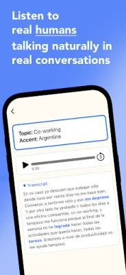 Zanurz się w autentycznym języku, słuchając nagrań natywnych użytkowników w realistycznych dialogach. Pełne transkrypcje towarzyszą każdej rozmowie, a kliknięcie na nieznane słowa natychmiastowo wyświetla ich wyjaśnienia, ułatwiając zrozumienie kontekstu i poszerzając Twój zasób słownictwa. Dodatkowo, ta aplikacja aktywnie wspiera rozwój Twoich umiejętności pisarskich. Codziennie możesz napisać 70 słów na wybrany temat, a zaawansowana sztuczna inteligencja precyzyjnie zidentyfikuje i poprawi wszelkie błędy gramatyczne, pomagając Ci szlifować precyzję i elegancję językową.
