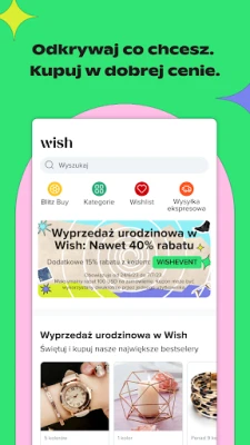 Wish to Twoja brama do świata oszczędności. Odkryj Urodzinową wyprzedaż z rabatami do 40% oraz dodatkowe 15% z kodem WISHEVENT. Skorzystaj z unikalnych ofert i zrób zakupy, zanim wyprzedaż dobiegnie końca.
